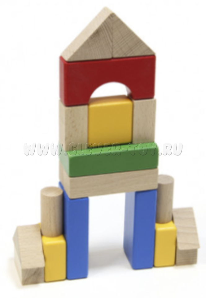 В наборе 20 элементов конструктора, которые выполнены из цельного бука и окрашены безопасными для здоровья красками на водной основе. Они не вызывают аллергию и не имеют неприятного запаха. Некоторые элементы конструктора оставлены в натуральном виде.