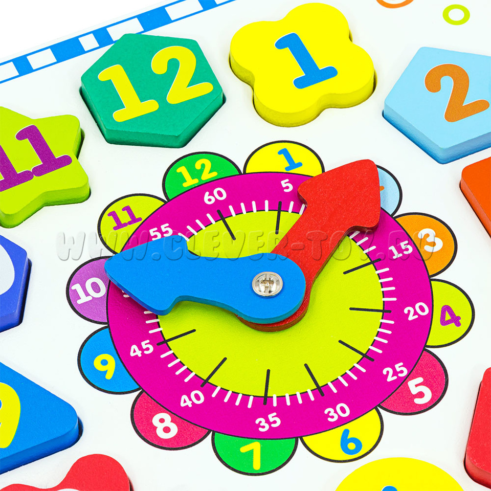 Фигуры расположены вокруг циферблата. С обозначением цифр от 1 до 12, разной формы и разных цветов. Поможет малышу познакомиться с геометрическими фигурами, развить логику, мелкую моторику. - Держатели-шарики по углам 4 шт.
