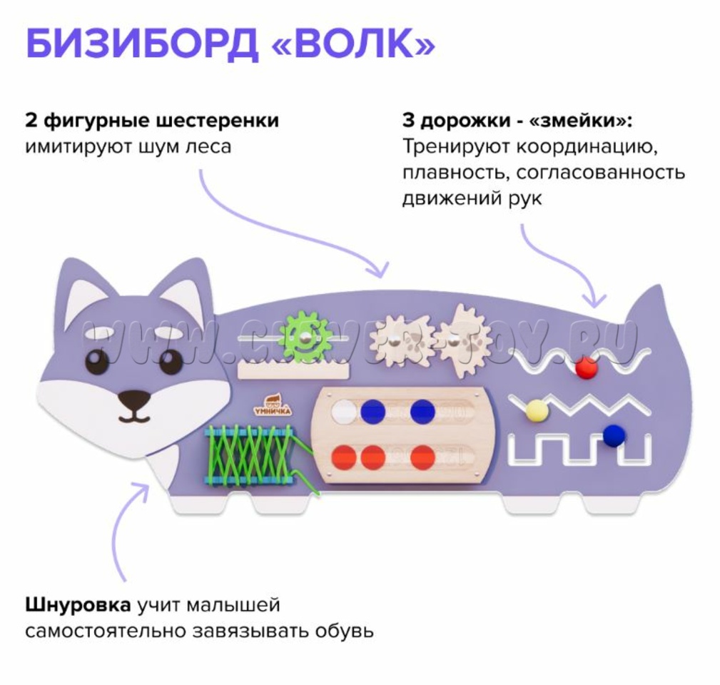 Бизиборд "Волчок" 2.0: Передвигающаяся шестерёнка, шнуровка, дорожки с фишками и бегунками-"змейками" - каждый элемент способствует развитию навыков, необходимых для развития самостоятельности и практических навыков для жизни.