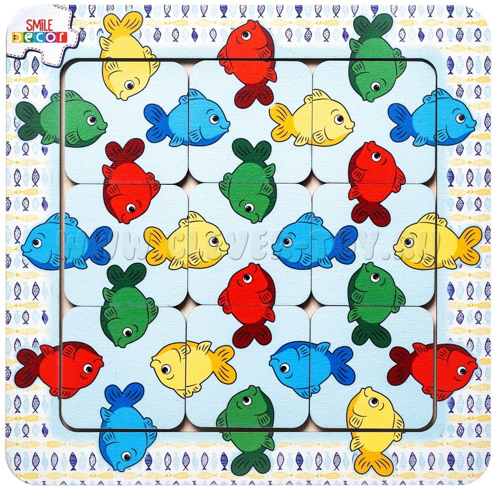 2. Игра "Собери рыбок". Достаньте несколько элементов головоломки из рамки-основания. Предложите ребенку вставить квадраты обратно в рамку так, чтобы половинки рыбок (голова и хвост) соответствовали друг другу по цвету. Если ребенок легко справляется с заданием, то извлеките все элементы и попросите собрать рыбок в аквариуме.