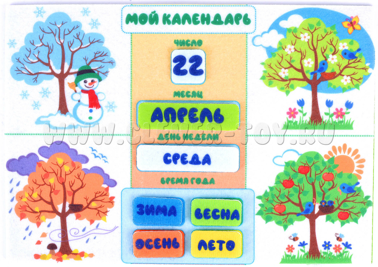 - игровые элементы: числа от 1 до 31, элементы с названиями дней недели, месяцев, времён года и т.д.