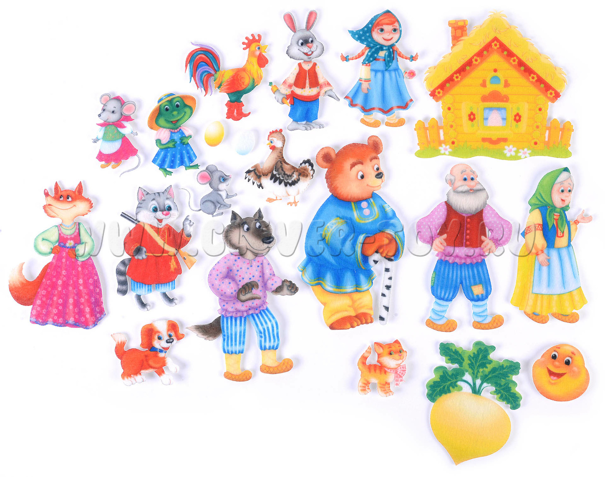 В комплект входят игровые элементы для пяти известных сказок: «Колобок», «Теремок», «Курочка Ряба», «Репка» и «Маша и медведь». Фигурки можно передвигать по полю или прикреплять с помощью липучек.