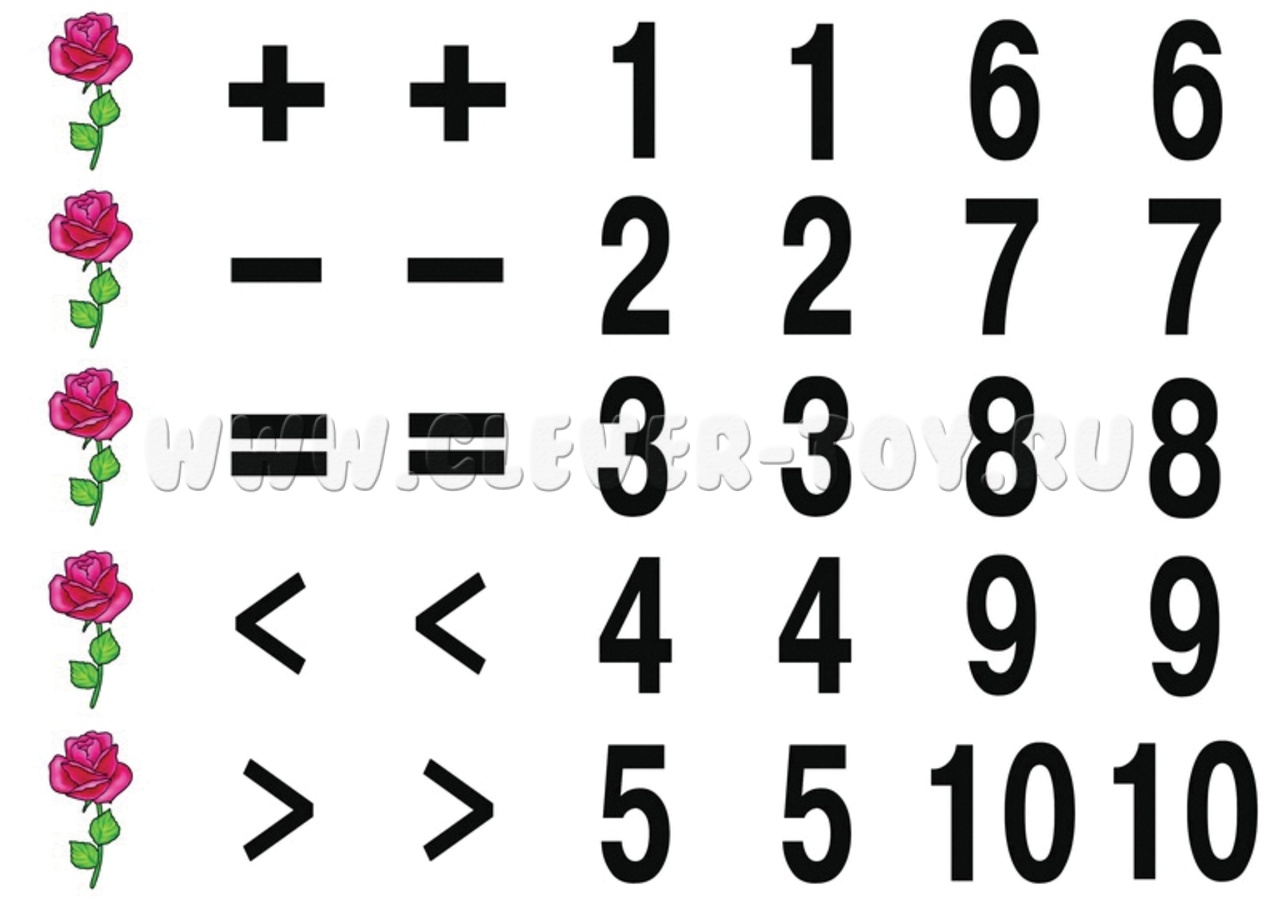 - Если дети уже умеют считать и знакомы с арифметическими операциями, предложите им составить простые примеры и неравенства. Для этого можно использовать не только цифры, но и все остальные карточки;