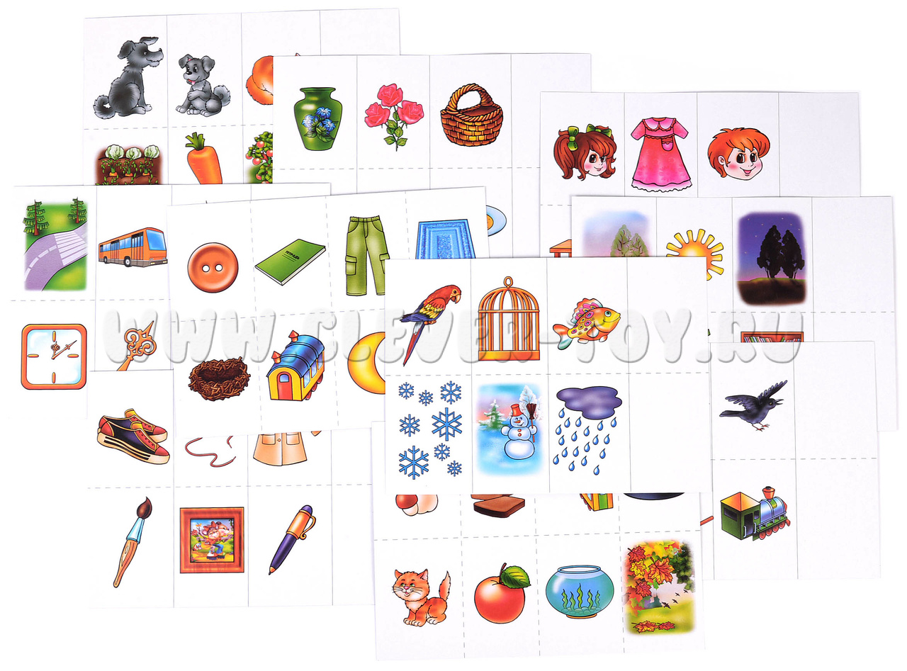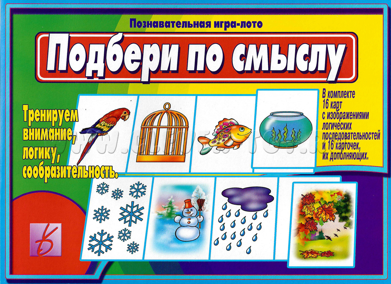 В наборе папка для хранения и 10 карт: 16 неоконченных смысловых цепочек и 16 картинок-окончаний. Перед началом игры разрежьте карты по пунктирным линиям. Предложите малышу найти закономерность и подобрать подходящую к цепочке картинку, выложив ее на пустую клетку карты. Попросите ребенка аргументировать свой выбор.