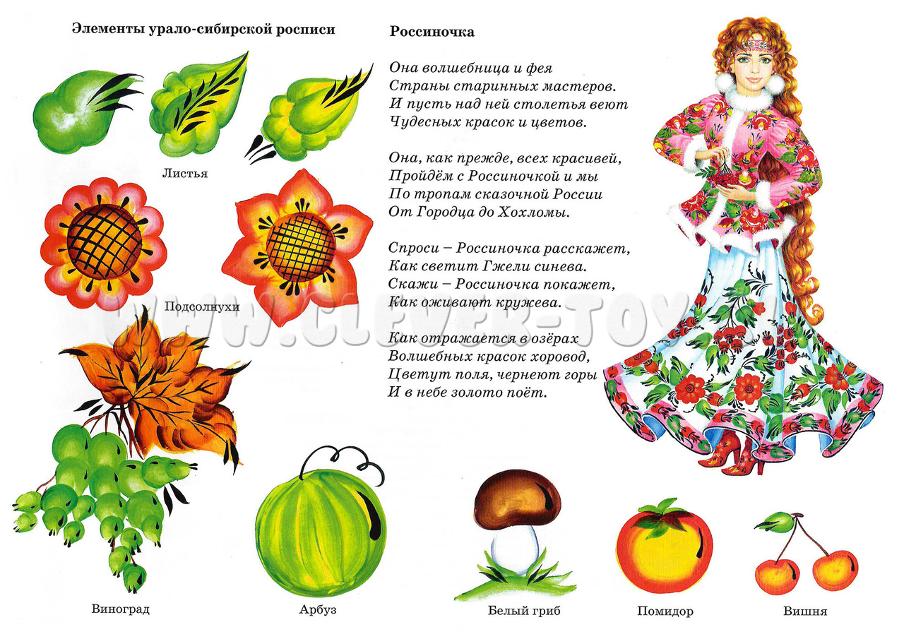 • Элементы урало-сибирской росписи (листья, подсолнухи, виноград, арбуз, белый гриб, помидор, вишня).