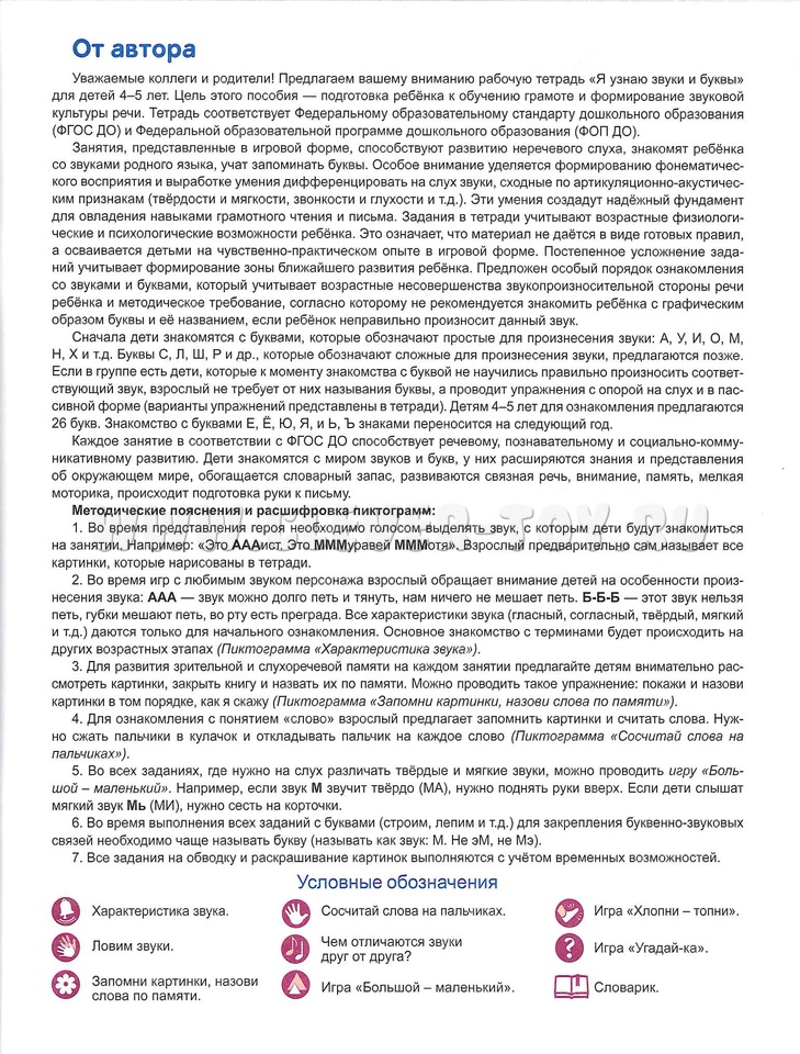 Занятия, представленные в игровой форме, способствуют развитию неречевого слуха, знакомят ребёнка со звуками родного языка, учат запоминать буквы. Задания в тетради учитывают возрастные физиологические и психологические возможности ребёнка. Это означает, что материал не даётся в виде готовых правил, а осваивается детьми на чувственно-практическом опыте в игровой форме.