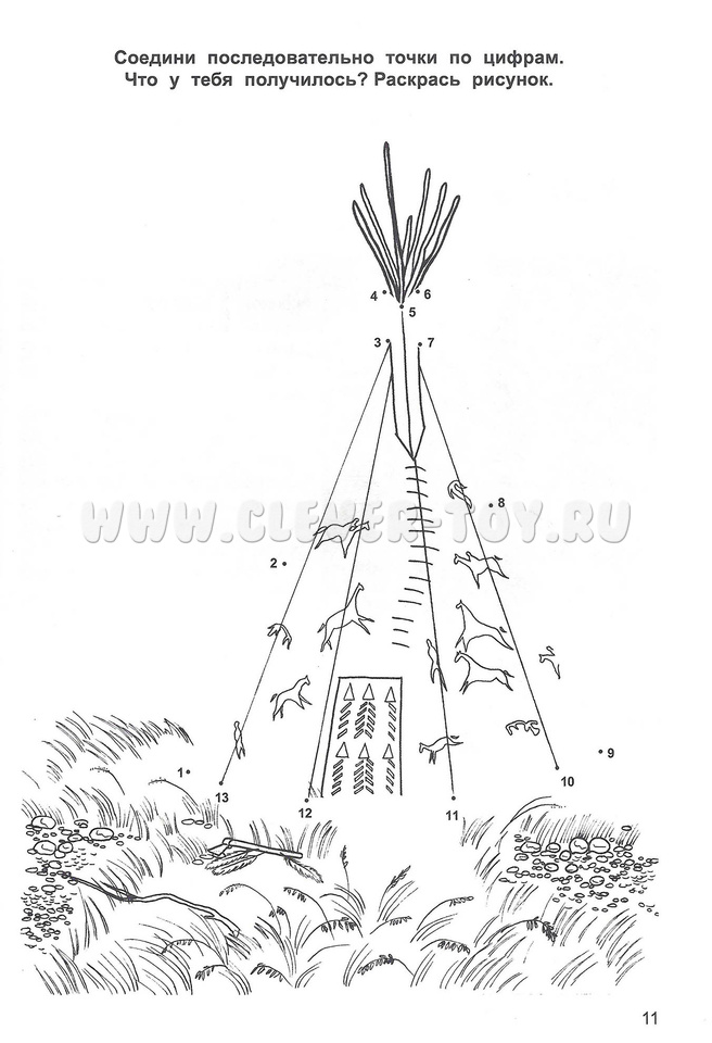 • Соедини линиями точки и раскрась рисунок (изображение чум и яранга);