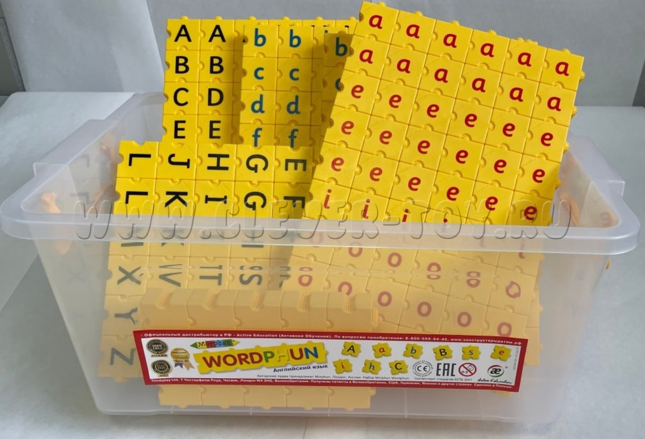 Обучающий конструктор Морфáн «ПРОслова Английский язык» применяется для увлекательных занятий английским языком и чтением. Состоит из деталей желтого цвета с нанесенными буквами и знаками препинания, соединяемых особым способом, исключающим неправильное расположение букв. Соединение крепко держит детали между собой, что очень удобно при составлении слов или предложений. Собранное слово ребенок может не только положить на стол (парту), но и взять в руки и показать педагогу (родителю), который сразу видит результат и если нужно исправит ошибку. Цветовое выделение букв дает возможность ребенку быстрее найти гласные (красный цвет), согласные (синий цвет) и заглавные буквы (черный цвет). Конструктор помогает выучить буквы, собирать из букв слоги, а затем фразы и предложения, осваивать правила орфографии и пунктуации. Комплекс заданий, упражнений и игр дает возможность значительно расширить словарный запас, развить память, речевые навыки, воображение, мышление детей.