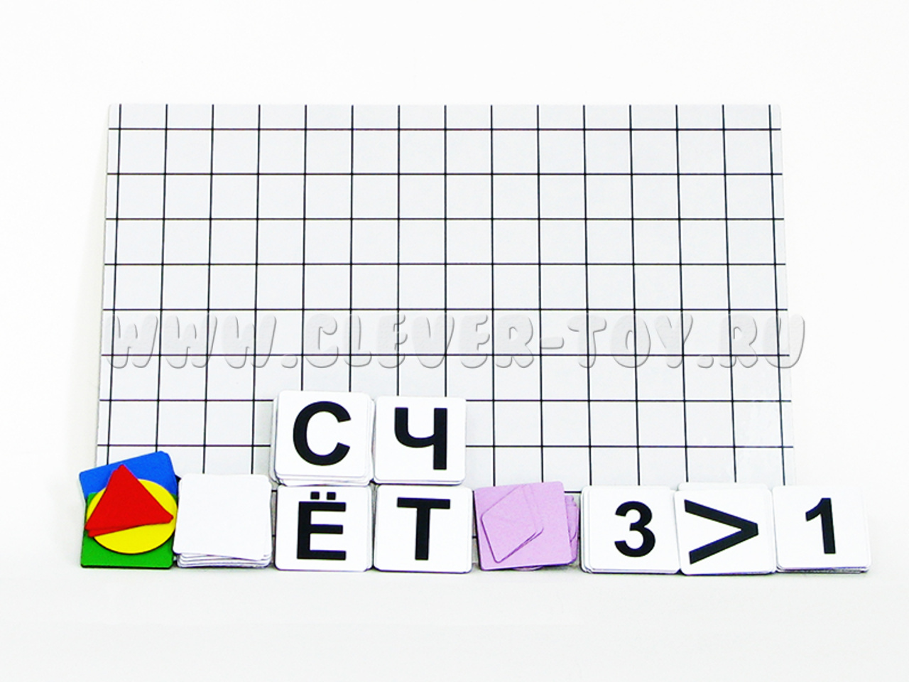 - 38 магнитных карточек с цифрами и знаками действий для составления примеров.