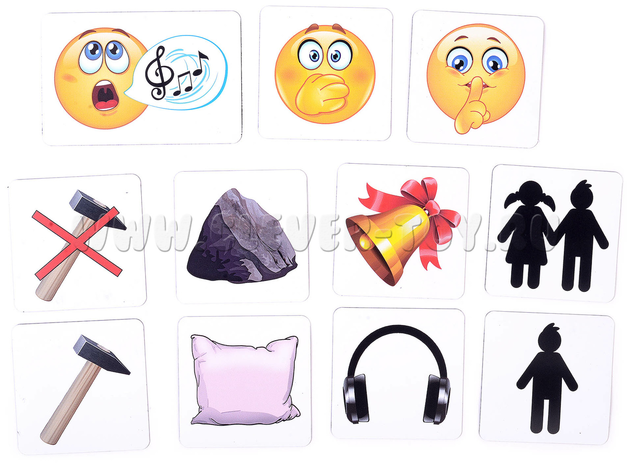 - Карточки с картинками: колокольчик – звонкие согласные, наушники – глухие согласные, камень – твердые согласные, подушка – мягкие согласные, молоток – ударные гласные и молоток перечеркнутый – безударные.
