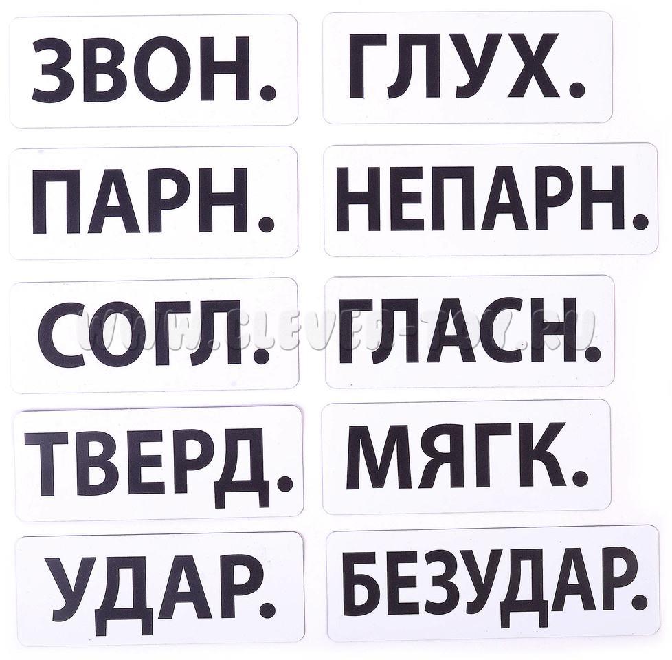 - Сокращенные надписи (согласные, гласные) – по 5 шт. (звонкие, глухие, твердые, мягкие, парные, непарные, безударные) по 3 шт. и ударные – 1 карточка.
