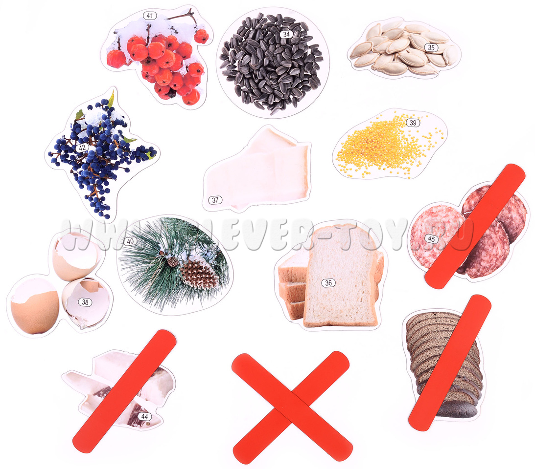 Карточки с изображениями: 34 семена подсолнечника; 35 семена тыквы; 36 крошки белого хлеба; 37 кусочки сала; 38 яичная скорлупа; 39 пшено; 40 орешки из шишек; 41 ягоды рябины; 42 ягоды бузины; 43 черный хлеб; 44 солёное сало; 45 колбаса; 46-50 красные магнитные полоски для зачёркивания тех продуктов, которые нельзя давать птицам.