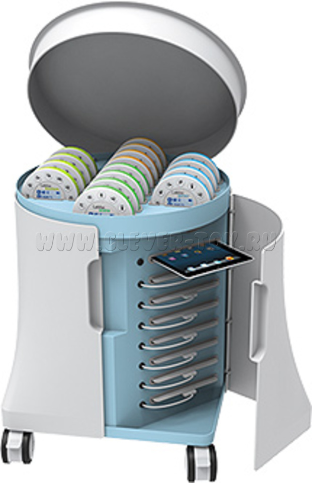 Мобильная тележка для хранения и подзарядки 16 ЛабДисков, в которую поместится любой набор цифровых лабораторий вместе с планшетами.